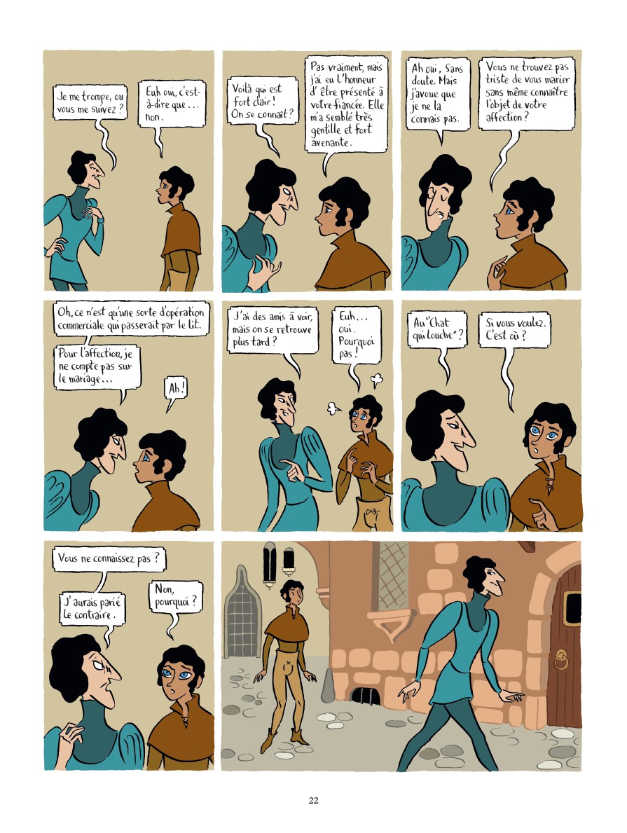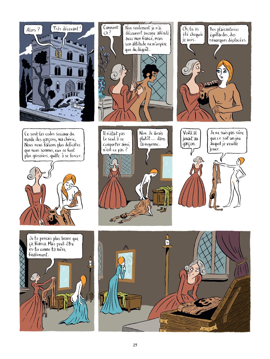 La grande force de "Peau d'homme", c'est justement l'idée saugrenue qu'il est possible pour une femme de littéralement changer de peau pour en connaitre un peu plus sur les hommes et leurs pensées. Mais surtout dans notre contexte contemporain, de proposer l'égalité entre homme et femme sur de meilleures fondements que ceux du passé. Parmi eux, le dogme religieux qui a dicté une conduite à tenir pendant des siècles, des livres traduits et interprétés par des hommes et pensés pour les hommes. Ainsi l'innocente Bianca découvre la masculinité dans toute sa splendeur ou sa médiocrité en voulant connaitre l'homme avec qui elle est supposée se marier, c'est là que l'exercice devient intéressant. Même si l’œuvre est parsemée de stéréotypes et mœurs de l'époque (moyen age), la narration fonctionne bien. Le dessin de Zanzim est simple et naïf, c'est parfois mieux travaillé sur les planches avec un dessin sur une page complète, sans non plus trop en faire dans le découpage. Son style permet ainsi lecture à tout type de public et de s'identifier facilement aux personnages, la BD reste abordable pour les jeunes adolescents sur certaines scènes plus explicite. Seul déception, lorsque Bianca se change en Lorenzo, elle peut d'après le début de l'histoire avoir une érection et profiter de l'orgasme masculin, mais cette idée de ressentir le plaisir "comme un homme" n'est pas dans au cœur des débats et l'item est complétement écarté par la suite. Donc l’œuvre ne parle pas du plaisir et de l'émancipation féminine et/ou masculine, mais surtout de la place des genres dans la société et remplit 80-90% des dialogues de la bande dessinée. Un bon moment de lecture, bien construit, malgré un dessin un peu trop simple.Le 13/06/2023 à 15:36:52
