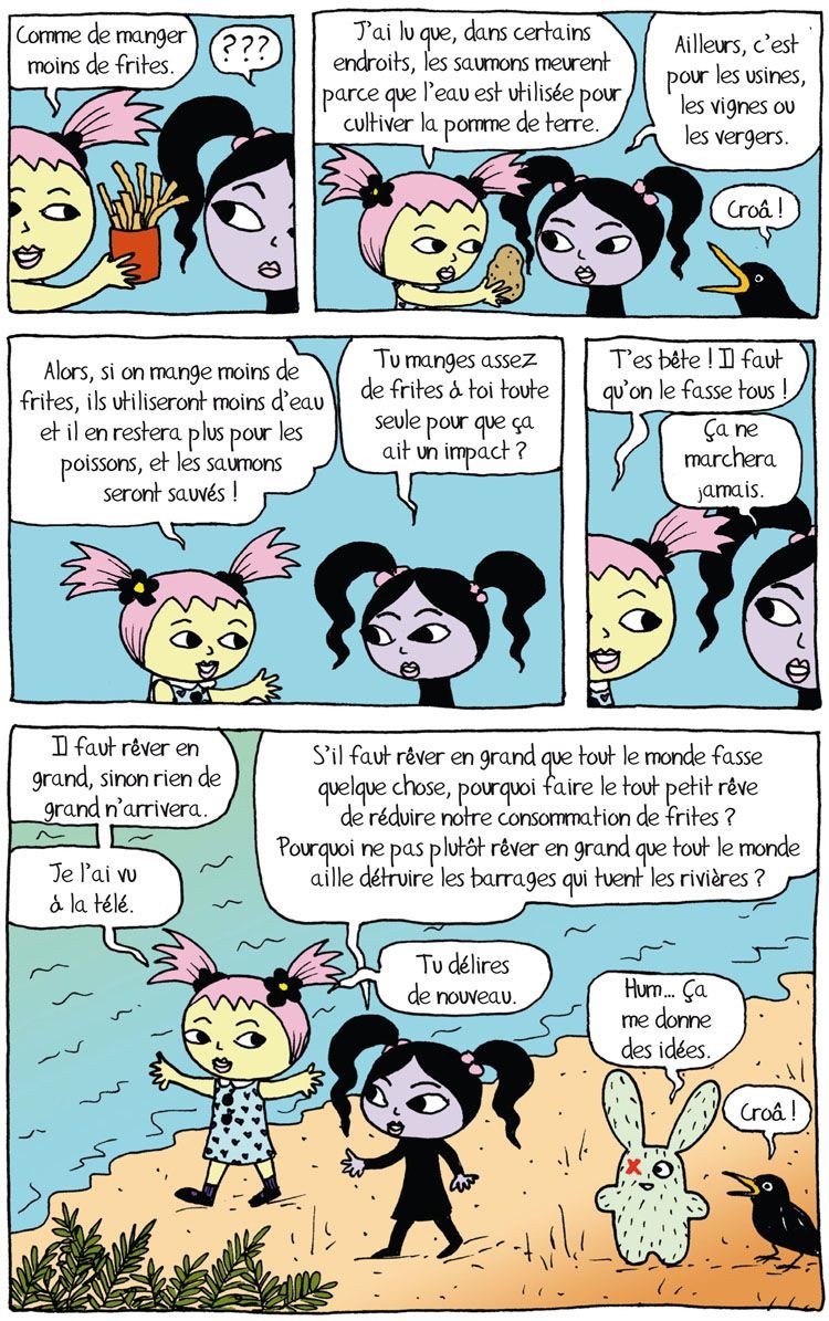Deux jeunes filles dissertent sur la manière d’endiguer la destruction de la planète. L’une pense qu’il faut appliquer les préceptes des livres et émissions de télé tandis que l’autre pense que toutes ces conseils sont juste faits pour endormir les gens et leur donner bonne conscience. Pendant ce temps, un lapin borgne décide de passer à l’attaque et fait sauter un barrage, détruit un centre d’expérimentation sur les animaux…