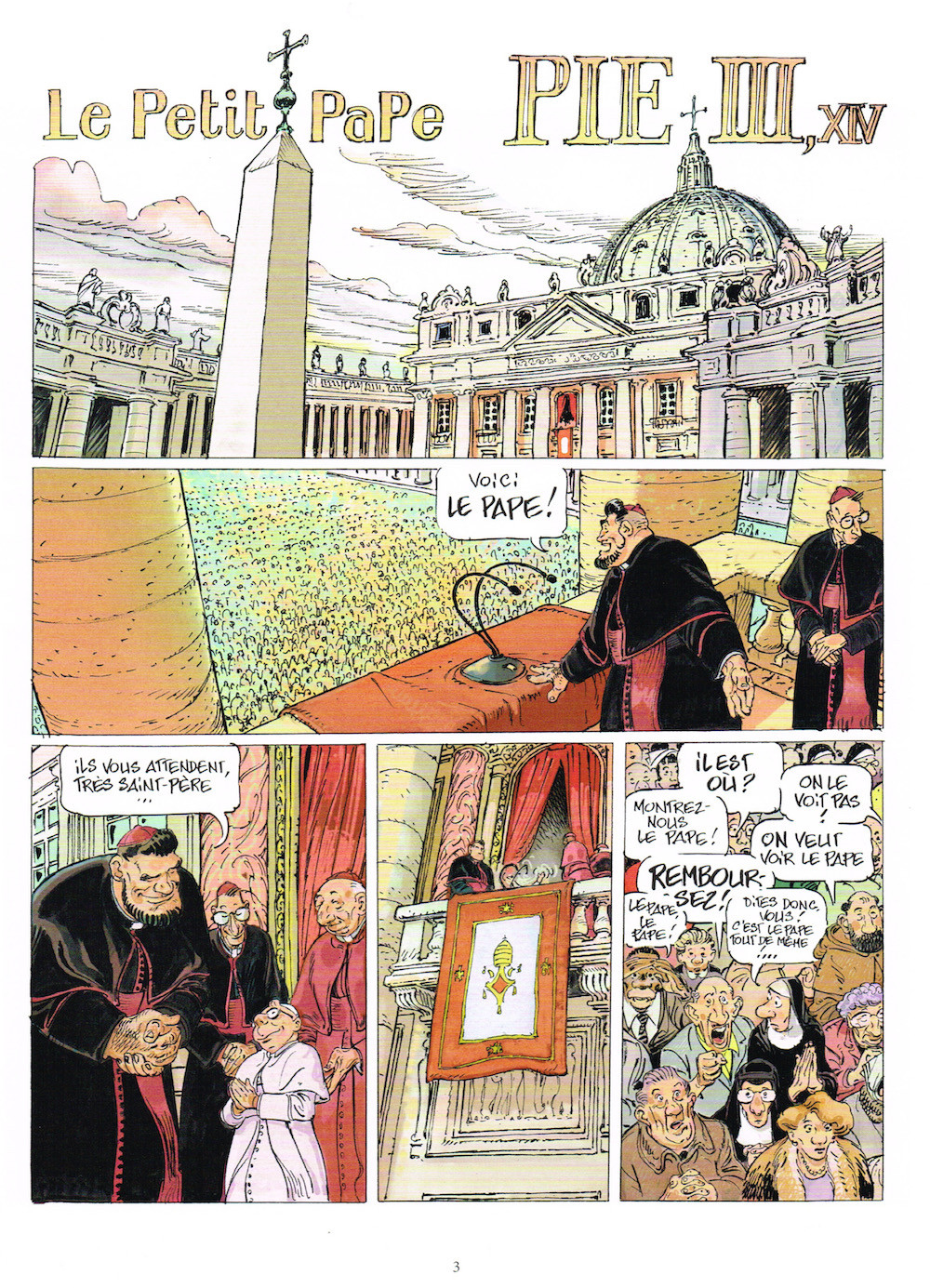 Résumé: C'est un évènement, le conclave vient d'élire un nouveau pape en la personne de Pie 3,14. La foule de fidèles se rassemble et découvre un pape haut comme trois pommes mais haut en couleurs ! Petit de taille, mais grand cœur, Sa Sainteté veut être le pape de tous sans exception, humble au point de remiser sa papamobile pour une simple poussette, joignable 7 jours sur 7 sur numéro vert non surtaxé ! Accompagné de Gontrand, son fidèle évêque à la stature imposante, Pie 3,14 vivra des aventures rocambolesques, d'audiences solennelles en bénédictions fantaisistes pour zombies, en passant par un improbable sauvetage du monde aux côté de Superhyperman.