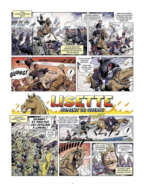 En parodiant l'adage, il est tentant de dire qu' "on ne change pas un concept qui gagne". Dans cet album de la série du Petit théâtre des opérations, le scénariste propose aux lecteurs de découvrir des petites histoires ayant alimenté la grande. Chaque personnage voit sa vie présentée en quelques planches avant une synthèse écrite et illustrée, ici de portraits ou de tableaux, afin d'en apprendre davantage. Défilent ainsi Lasalle, le capitaine de Chambure qu'il aurait fallu laisser dormir tranquillement ou bien Daumesnil à qui Napoléon a demandé de garder le château de Vincennes. Loin de mettre uniquement le genre masculin en lumière, l'auteur a déniché la vie de la vraie Madame Sans-gêne, alias Marie-Thérèse Figueur. Il présente aussi la manière dont certaines épouses anglaises ont pu suivre leurs hommes à la guerre, non sans causer quelques légers soucis logistiques. Les amis des animaux en ont également pour leur argent avec la présentation de Lisette, une jument de guerre ayant du mordant. Enfin, certains chapitres sont séparés par des anecdotes dessinées comme l'origine de l'expression "Saouls comme des Polonais".