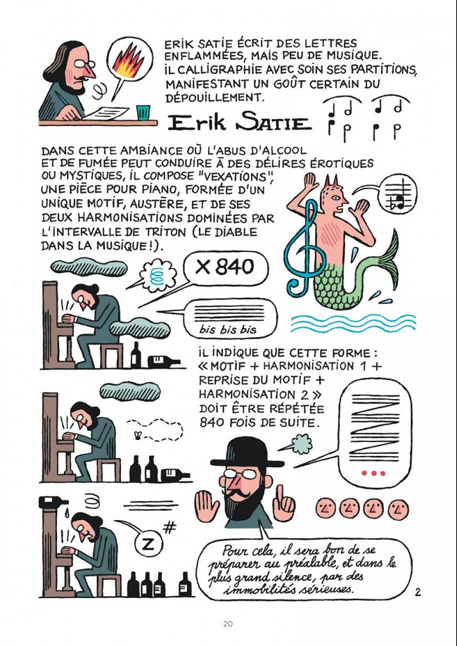 Tout au long de l’album, les deux compères racontent, sous la forme d’un dialogue fort amusant, les différents aspects que ce mouvement a pris à travers le temps. Les explications sont denses, mais toujours limpides et les exemples innombrables et immanquablement parlants. D’Erik Satie à Miles Davis, de Le Corbusier à Herzog & de Meuron et d’E.O. Plauen à Lewis Trondheim, il y en a vraiment pour tous les goûts ! Résultat, sans en avoir l’air, l’ouvrage fait à peu près le tour de leur programme d’une manière élégante et passionnée. Synthétique, complet et intelligent, Le minimalisme se révèle être une franche réussite et devrait séduire tant les amateurs d’Art que ceux de bande dessinée.
