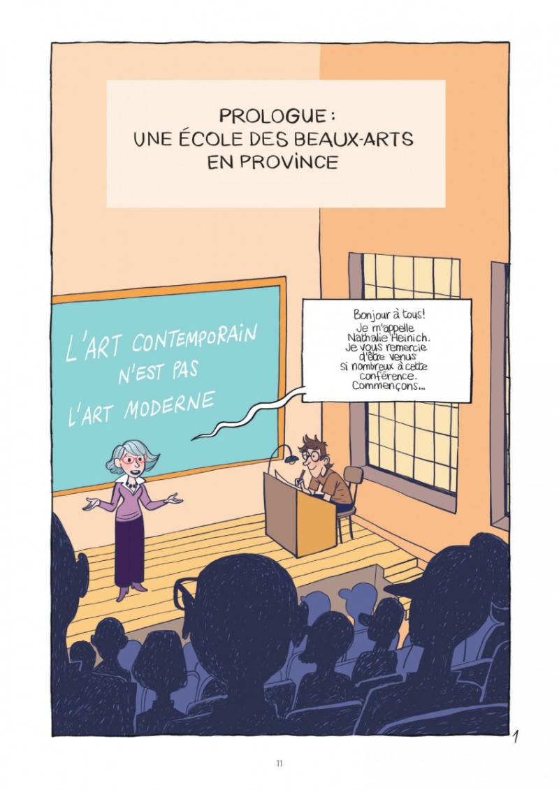 La formule est efficace, divertissante et néanmoins éducative. La spécialiste décrit le rôle de l’État et celui des mécènes qui portent aux nues le créateur qui répond à leurs attentes. Elle explique que la production actuelle se caractérise par la transgression, l’assemblage et le métissage des genres ; la peinture est pour sa part la mal-aimée des institutions. Certes, on tourne les coins ronds et les personnages sont des archétypes. Mais à travers ces trois figures, l’auteur fait le point sur une industrie, car c’est bien de cela dont il s’agit.