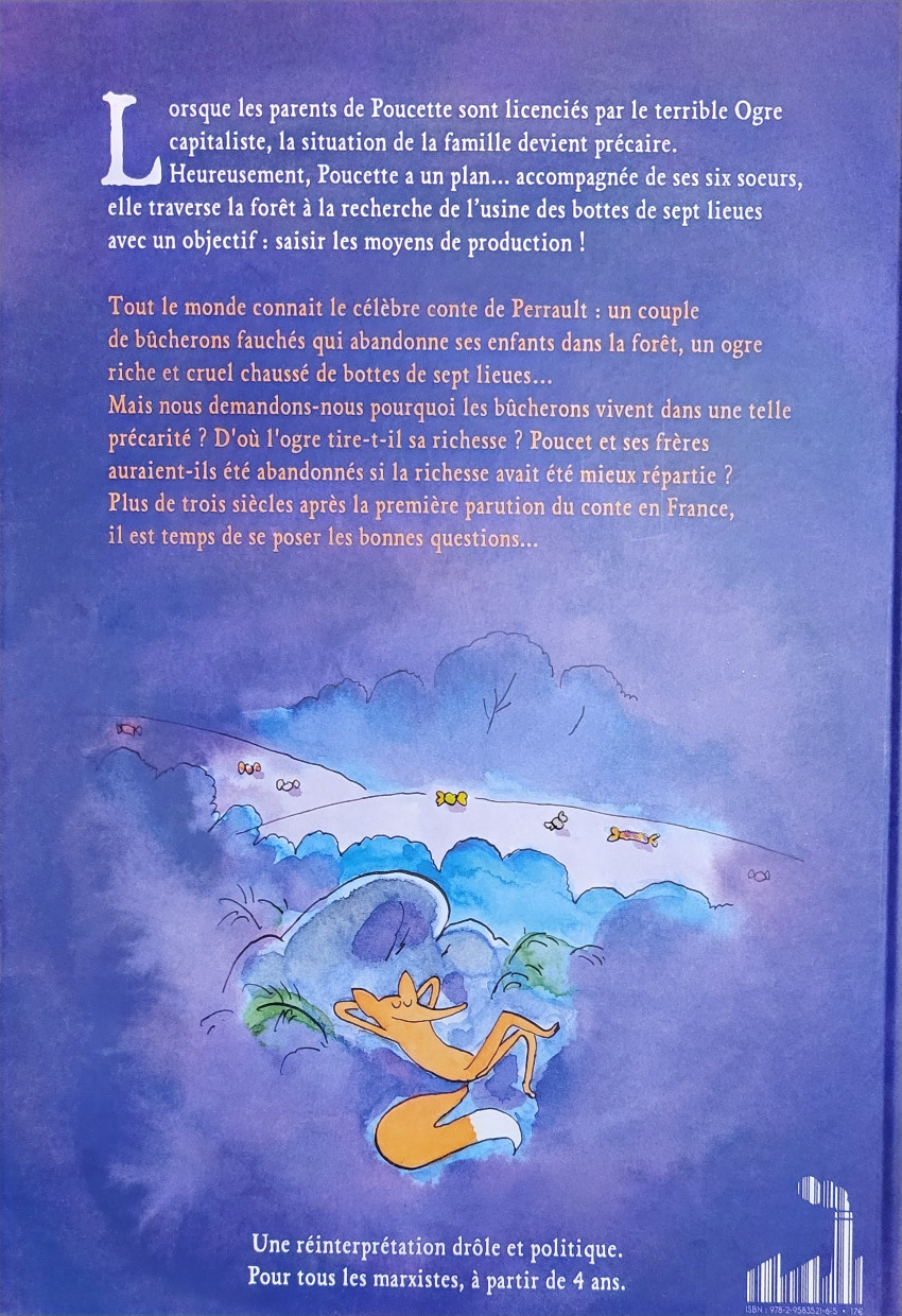 Résumé: Poucette vit avec ses six sœurs dans une petite maison au cœur d'une grande forêt. Chaque jour, ses parents partent travailler dans une usine de fabrication de bottes, propriété du terrible Ogre Capitaliste. Mais un jour, malheur... ils sont jetés à la porte ! Bientôt, ils n'auront plus d'argent pour nourrir leurs sept filles...