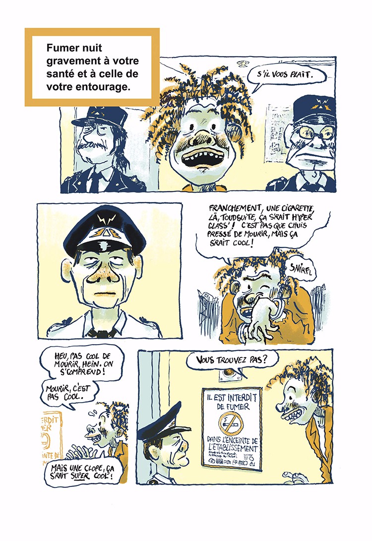 Le dessin, nerveux, souvent hyperchargé ne laisse pas indifférent et rappelle par moments celui de Reiser. La construction des planches est ponctuée de petits artifices sympathiques (par exemple des cases rondes ou encore les propos moralisateurs qui sont présentés dans un cadre épais semblable à celui des campagnes anti-tabac). Ce n’est malheureusement pas suffisant pour maintenir l’intérêt.