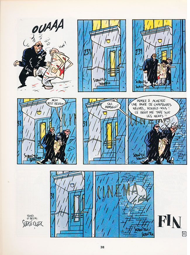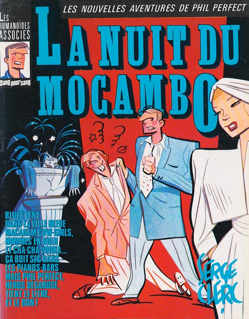 Judicieusement intégré intégralement dans l’intégrale Phil Perfect (même les pages noires), il ne manque plus à La nuit du Mocambo que sa couverture aux têtes aux carrés et aux gueules de bois, pour retrouver sa jeunesse. Une couverture aussi molle et verbeuse (cette Typo avec ce O qui tient pas debout, digne d’un flyer du Macumba de Saint-Julien-en-Genevois) qu’une de celles des Inrockuptibles, mais beaucoup beaucoup plus rock, c’est la moindre des choses. Page 89, s'il n'en fallait qu'une, "Nid d'espions à Alpha-plage", le genre d'histoire qui vous passe l'envie d'en relire d'autres pendant trois semaines et vous pose son propriétaire (de l'histoire, pas du livre) pour l'éternité. Serge Clerc, un jour à la droite de Chaland et à la gauche de Braque. Pas Ferdinand, l’illustre recordman de l’heure à l’Olimpico de Rome le 30 octobre 1967, à la moyenne de 48,093 km, mais Georges, moins connu celui-là.BDGest 2014 - Tous droits réservés