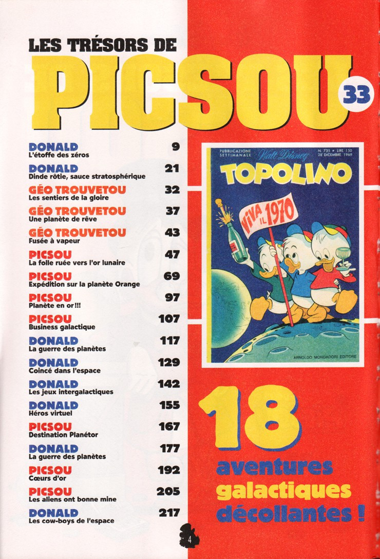 Résumé: Les 6 premières histoires ( Sc et Des Carl Barks) , 7 - Piscou Expédition sur la plamnète Orange (Sc: Dalmasso, Des: Cavazzano), 8 - Picsou Planète en or!!! ( Sc: Meul, Des: Verhagen), 9 - Picsou Business galactique ( Sc: Trench et Angus, Des: Branca), 10- Donald la guerre des planètes (Sc: Halas et Martin, Des: Vicar), 11 - Donald Coincé dans l'espace ( Sc: Gilbert, Des: Vicar), 12 - Donald les jeux intergalactiques (Sc: Halas, Des: Vicar), 13 - Donald héros virtuel (Sc: Hamill, Des: Vicar), 14 - Picsou destination planétor (Sc: Jonker et Hoogma, Des: Heymans), 15 - Donald la guerre des planètes (Sc: McGreal, Des: Esteban), 16 - Picsou Cœurs d'or ( Sc: Jensen, Enc: Perea, Des: Peinado), 17 - Picsou Les aliens ont bonne mine ( Sc: Laban, Des: Aguilar), 18 - Donald les cow-boys de l'espace (Sc:N?rum, Des: Midthum)