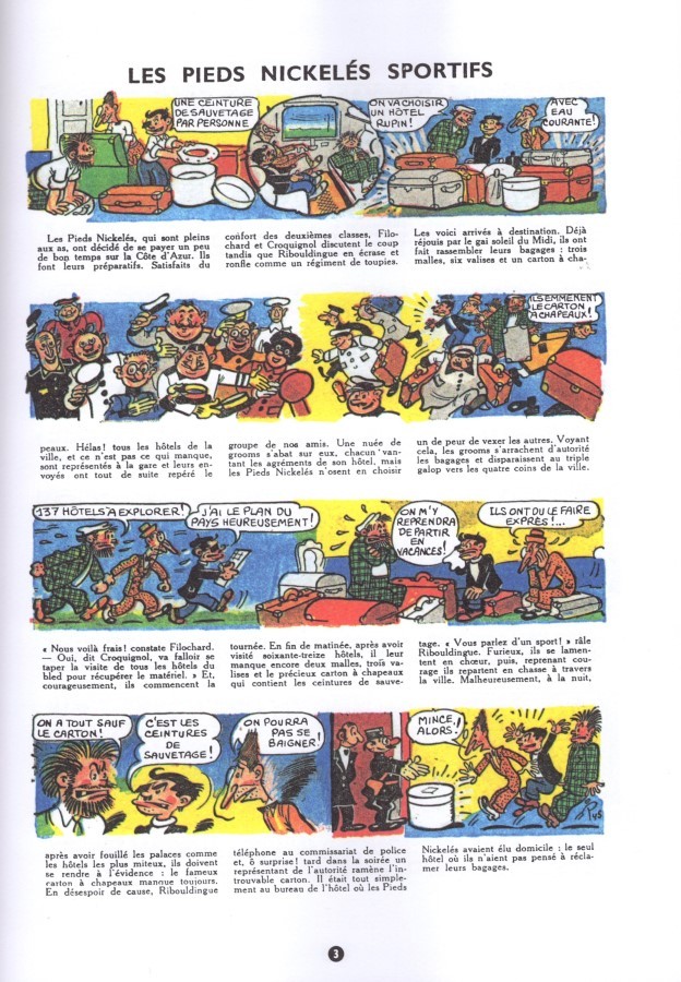 Résumé: Alors qu'ils se prélassent à la terrasse d'un café, Croquignol, Filochard et Ribouldingue s'invitent au Tour de France. Non pas en tant que spectateurs mais plutôt en tant que participants actifs à la course. Car l'étape qui doit se dérouler le lendemain est pourvue d'un prix exceptionnel que le trio ne peut que lorgner d'un œil avide. Après cette escapade cycliste, ils se proclament maîtres nageurs dans un grand palace et tentent d'assumer leur vénalité légendaire. Par la suite, c'est à saute-mouton que les trois larrons cherchent à s'emparer d'un trésor pour le moins rugissant. Enfin, Les Pieds Nickelés retournent à la Capitale et s'emparent d'un camion dont la cargaison va leur amener quelques bonnes suées. Auraient-ils l'âme de sportifs?