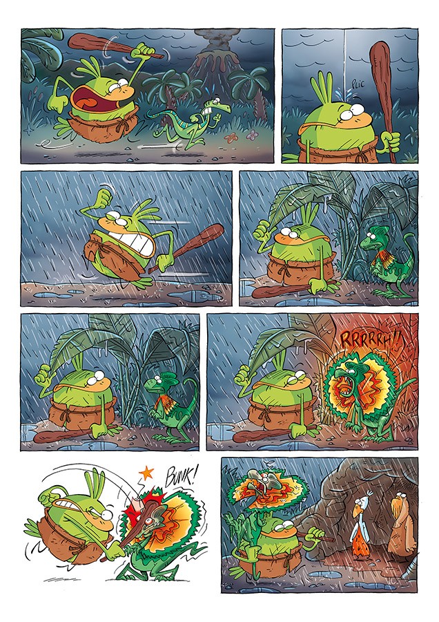 Le Piou, sorte d’oiseau reconnaissable à son cri « Piou ! Piou ! » nous plonge en plein Jurassique. Le langage n’ayant pas encore été inventé, force est de constater que les gestes restent un moyen de communication qui ne permet pas toujours d’exprimer clairement sa pensée, ce qui peut donner lieu à quelques situations embarrassantes, en particulier pour ceux qui se font bouffer par des piranhas, par exemple, malgré la bonne volonté du Jurassic Piou pour venir en aide à ses contemporains en inventant le pictogramme. On assiste à des séances de poursuites dignes de Jurassic Diana Jones où le plus gros cherche toujours à avaler plus petit que lui… Ce n’est pas sans me rappeler certaines scènes de la vie politique et économique courante… Attention, certaines planches sont d’une cruauté insoutenable ! Le sort réservé aux pauvres « Piii ! Piii ! » par exemple pourrait entraîner des cauchemars auprès d’un public sensible. Ne laissez pas les enfants lire cette BD, ils en sortiraient traumatisés au point d’être Donaldtrumpisés à vie. Un livre inénarrable ! Des délires à toutes les pages. Un bon petit moment de rires et de sourires sans prise de tête.BDGest 2014 - Tous droits réservés