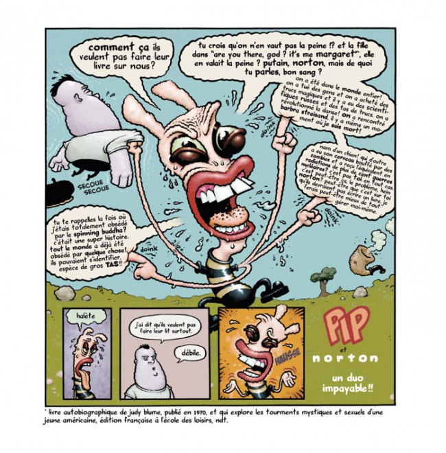 u Dave Cooper en couleur, ça change quelque chose ? Pas vraiment en fait et c’est tant mieux. Même univers cartoonesque perverti - à mi-chemin entre le Frank de Jim Woodring et le Squeak the Mouse de Massimo Mattioli -, mêmes personnages névropathes et demeurés. Mais sinon, les aventures de Pip & Norton, c’est quoi ? Et bien, d’un côté, il y a donc Pip, un faux-bourdon sous acide, travaillé par des désirs primaires et agité de soubresauts compulsifs ; de l’autre, Norton, le compagnon un rien maso qui se laisse systématiquement entraîner dans les délires du premier. Derrière le duo infernal, il y a la plume de Gavin McInnes, le fondateur du magazine Vice, et le dessin organique, humide et frémissant de l’ami Cooper. On y est. Oui, mais où ? Probablement dans les égouts de la maison Disney et la plomberie n'est pas aux normes. Cela suinte, ça refoule et c’est tout bonnement hilarant. Une pochade déjantée, sur un lit de jus de chaussette et d’intestins de vache. Bref, le bizarre fait ici partie du décor et les freaks font la loi. Matt Groening est fan. Il n’est pas le seul.
