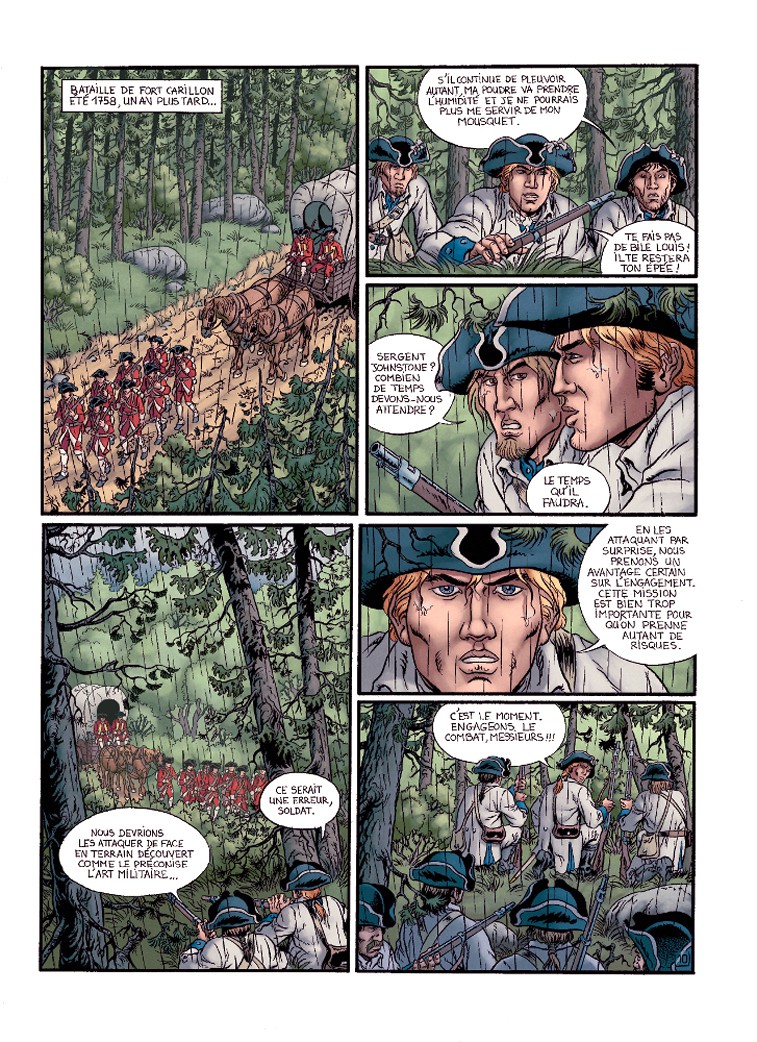 Une narration fluide et bien menée, un cadre historique remarquablement reconstitué, des personnages intéressants et de gros enjeux dramatiques... Ce tome 1 est une réussite. Le protagoniste, né d'une mère française et d'un père anglais, doit prendre part à la guerre opposant les deux pays pour le contrôle du Québec. Il est dans le camp des français, mais évidemment ses origines le rendent suspect... Au fil des pages, on apprend énormément de choses sur cet épisode sanglant de l'histoire du Québec, mais tout passe par le récit et on ne s'ennuie pas une seconde. J'ai particulièrement aimé les séquences de déplacement avec ces paysages qui restituent magnifiquement le Québec du 18e siècle... Ces grands espaces qui sont aussi le théâtre d'embuscades et de terribles batailles... Ça m'a vraiment donné envie de mieux connaître ce pays... et de lire la suite de l'histoire !!Le 07/02/2014 à 20:17:15