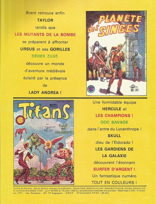 LE SECRET DE LA PLANETE DES SINGES : Trés bonne adaptation du procés de BRENT au tribunal des mutants adorateurs de la Bombe. Les dessins sont superbes malgrés l'absence des singes (juste trois pages) et la terrible révélation de la véritable nature des mutants trés bien retrenscrite.
