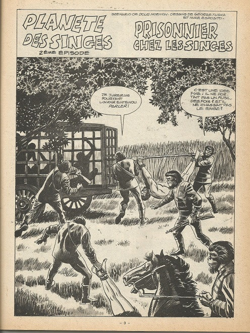 LA PLANETE DES SINGES : Le scénario suit à la la lettre le film donc à ce niveau toujours pas de surprise. Par contre le dessin de GEOGE TUSKA est tout juste moyen pour les humains comme d'habitude mais alors pour les singes !!! Il n'y a aucune recherche !!! Trés décevant grapiquement parlant.