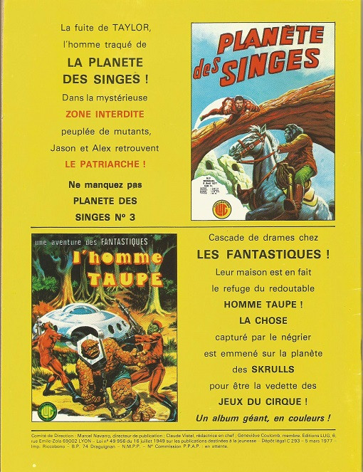 LES PROSCRITS DE LA PLANETE DES SINGES : On suit toujours avec intéret les périgrinations des deux héros (1 homme et 1 singe) pour tenter de prouver que les gorilles cherchent à créer un conflit entre les deux races. Le personnage humain est peut-être un peu trop impulsif. Les dessins en NB sont vraiment intéressants. LA série de l'album.