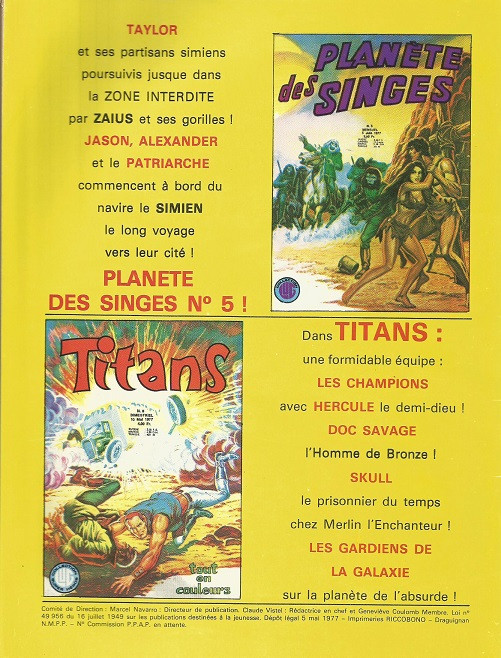 LES PROSCRITS DE LA PLANETE DES SINGES : On a vraiment un melting-pot des genres au niveau des personnages : singes, hommes, mutants, semi homme-bête et même un DAVY CROCKETT chinpanzé. Ce foutoir est néanmoins sympathique à suivre. Les dessins sont trés intéresssants.