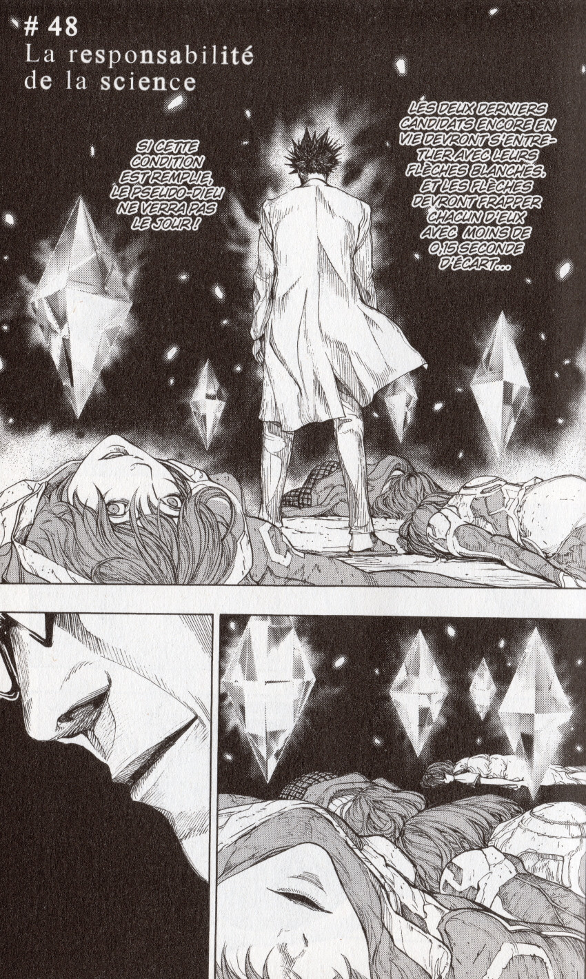 Résumé: Sous le regard des caméras, la discussion entre les derniers candidats a finalement tourné court. Mirai a annoncé qu’il était prêt à devenir dieu tandis que le professeur Yoneda a affirmé vouloir empêcher à tout prix l’avènement d’une créature fantoche : l'affrontement entre les deux hommes est devenu inévitable. Les voilà face à face, armés chacun d'une flèche blanche. Mais même moment, la situation de Saki et Yuri, qui observaient le duel depuis un lieu éloigné, bascule subitement !
