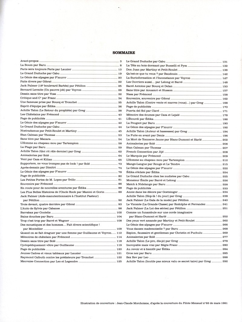 Résumé: Ce quatrième et avant-dernier recueil contient une sélection d’histoires courtes parues dans Pilote entre 1980 et 1985. Il y a de véritables trésors et un casting de rêve : Gibrat, Baru, Pierre Desproges, Cabu, Pétillon, J-C. Denis, Veyron, Solé, Cabanes, Jijé, Blanc-Dumont, Greg, Goetzinger, Christin, Baudouin, Buzzelli, F’murrr, Boucq, Mouminoux, Cailleteau, Vatine, Caza, Tronchet, Manara, Le Tendre, Ferrandez, Rodolphe, Régis Franc, Morschoine… Amusez-vous à réfléchir !