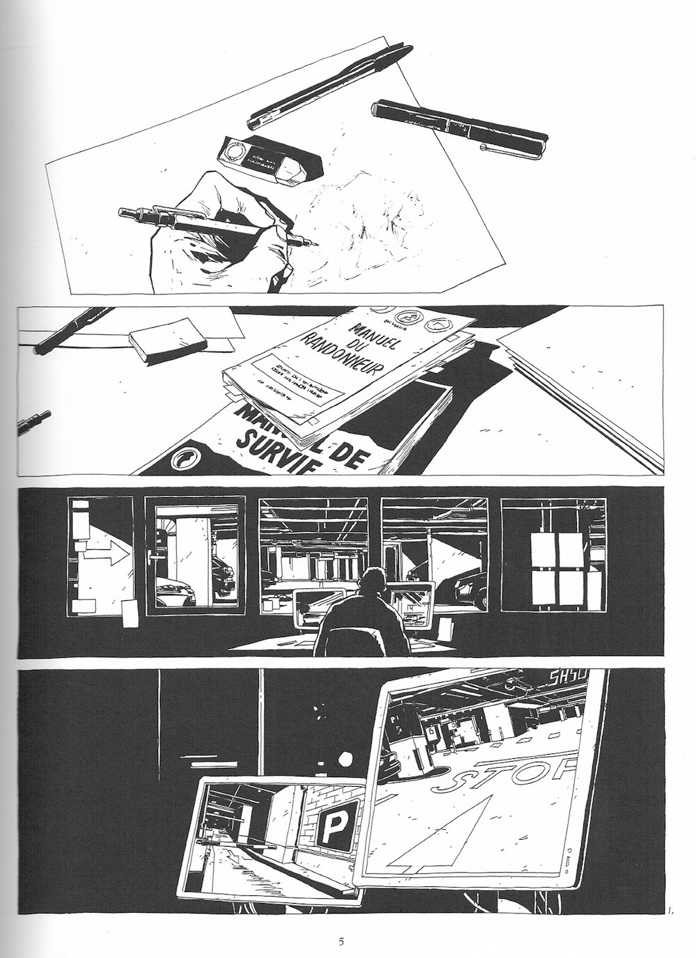 Le très beau noir & blanc de Chapouté nous invite au voyage, avec cette petite histoire tranquille et ordinaire. Une invitation à ouvrir notre regard non pas sur un lointain Alaska, mais bien sur le monde qui nous entoure ici et maintenant.. L'alsacien Christophe Chabouté est né en 70 et l'une de ses premières BD à rencontrer le succès sera Pleine lune, un récit policier publié en 1999. La consécration internationale viendra avec Tout seul, un album sorti en 2008. Depuis le début de sa carrière, Chabouté reste fidèle à ses propres standards : un noir & blanc clair et précis, des héros plutôt ordinaires, une mise en page dynamique et des récits de peu de mots. Alexandre est gardien de parking. Gardien de nuit. Et pour une fois, il a décidé de partir plus loin qu'ailleurs. « [...] - Et qu'est-ce que tu vas faire pendant des vacances ? T'en as jamais pris de ta vie ! Ça fait bien 20 piges que tu as le cul vissé sur cette chaise toutes les nuits. le nez dans tes dessins. - Je pars en Alaska ! [...] Je vais faire un trek. L'Alaska, le Klondike, le bout du monde quoi. » [...] Je vis au même endroit depuis bientôt 28 ans. Je n'ai jamais vu la tête de mes voisins. Je n'ai jamais dit bonjour à mon facteur. Je ne sais même pas à quoi il ressemble. Je vis dans un quartier que je ne connais pas. [...] Une vie de hibou. » Le voici donc qui se prépare à suivre les traces de Pete Fromm, son livre de chevet, après avoir glissé le "Manuel du randonneur" dans son sac. Jusqu'à l'aéroport tout va bien. Mais là, patatras, son voyage est annulé. Et double patatras, Alexandre se casse la cheville dans les escalators. le voilà de retour à la case départ où l'envie le reprend de radicalement changer d'air ou de point de vue : il prend donc une chambre dans l'hôtel ... en face de chez lui, juste de l'autre côté de la place. À défaut d'ours polaires et de grands espaces il va enfin pouvoir découvrir son quartier et ses habitants. Étudier ses voisins (nous ?), leurs chaussures, leurs téléphones, leurs comportements, les bruits, les couleurs, les petits papiers jetés ici ou là. Et le soir, de retour à son hôtel, Alexandre prend des notes dans son carnet de voyage. La première sera : « partir en restant ». Chaque "randonnée" autour de la place du quartier est l'occasion pour Alexandre et son lecteur, d'une petite leçon de vie, comme on dit. ➔ Les dessins de Chabouté sont passionnants. Ce beau noir & blanc net, précis, laisse entrevoir de nouveaux détails à chaque lecture. Les pages ne sont pas envahies de bulles verbeuses ou explicatives et c'est avec l'enchaînement des plans, des cadrages, leur répétition, que le lecteur devine ce qui se trame. ➔ Il y a là ce ton paisible des histoires tranquilles et ordinaires. Une astucieuse histoire qui se conclut de jolie façon, dans une ambiance qui rappelle beaucoup celle des albums d'Etienne Davodeau. ➔ Et puis il y a là les petites leçons de vie qui nous sont dispensées, sans prétention, destinées à ouvrir notre regard non pas sur un lointain Alaska, mais bien sur le monde qui nous entoure ici et maintenant. Pour « se dépoussiérer les yeux » sur notre environnement, les passants, les voisins, ... On frôle parfois la gentille philosophie quand une simple liste de courses devient une « nature morte » ou même la question existentielle quand on se demande si « un poisson au fond de l'eau entend râler le pêcheur assis sur la berge ? ». Malgré ses apparences trompeuses ou paradoxales, cet album est tout de même un bel appel aux voyages.Le 28/05/2025 à 15:52:06