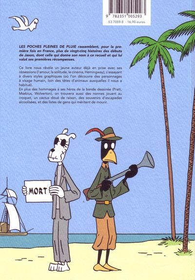 C'est un Jason un peu spécial qui paraît là car il s'agit de près de 25 histoires qui rassemblent celles du début de sa carrière. J'ai beaucoup aimé la première nouvelle qui est la plus longue et qui s'intitule «Les poches pleines de pluie». Il n'y a pas encore ses personnages animaliers récurrents mais cela commence à venir. On y croise par exemple un extra-terrestre qui s'empare d'une mallette pleine d'argent. C'est du très bon comics avec un auteur qui semble porter un regard désabusé sur le genre humain. Bref, il y a là toute une facette du talent artistique de l'auteur qu'on découvre. Il a choisi par la suite une autre voie plus personnelle et atypique. Les autres récits comblent un vide et ne sont manifestement pas à la hauteur de ce premier récit qui mériterait à lui seul un 4 étoiles. Pour le reste, cet ouvrage nous permet de découvrir un jeune auteur qui se cherche dans un style graphique bien à lui et qui explore des thèmes qui reviendront par la suite : l'amour, le cinéma, la solitude, Hemingway...BDGest 2014 - Tous droits réservés