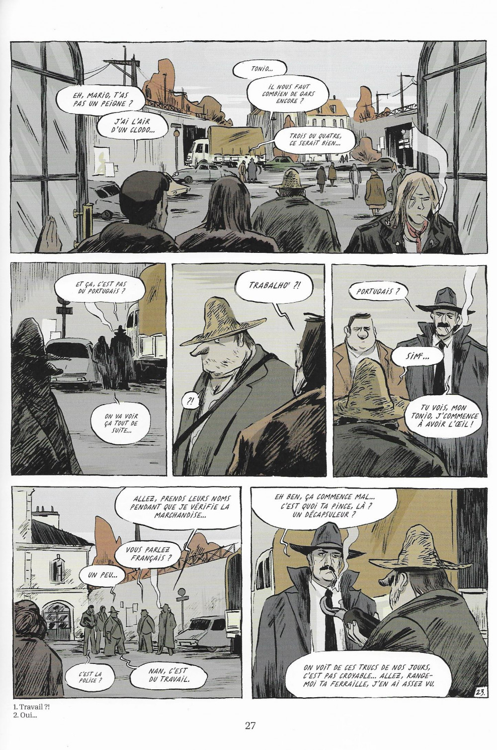 À travers le portrait d’un personnage, Olivier Afonso raconte l’odyssée de sept cent mille clandestins ayant suivi le même chemin entre 1957 et 1974. Le protagoniste n’a rien de particulier ; cette banalité fait d’ailleurs son intérêt et le rend attachant. Le scénariste le dépeint dans une sorte de tiers-monde avec ses taudis, patrons retors et policiers corrompus. Mais, loin de se complaire dans un narratif misérabiliste, il insiste plutôt sur la solidarité, la tendresse et l’amour. Et au final, comme dans les contes de fées : ils se marièrent et eurent un enfant (ou plus, l’histoire ne le dit pas).