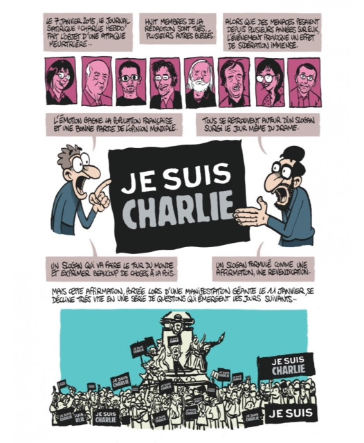 Bédéiste, enseignant d’histoire et rédacteur d’une thèse de doctorat sur ce sujet, l’auteur d’Une année au lycée a le curriculum vitæ parfait pour mener l’enquête. Avec un mélange d’humour et d’érudition, il rappelle la genèse des médias sarcastiques, puis répond aux arguments de ses détracteurs qui lui reprochent de se moquer du sacré, d’adopter un discours violent ou encore de se montrer grossier. L’exercice permet d’expliquer de façon convaincante que la satire est nécessaire et que le droit à l’exercer demeure essentiel à la démocratie. Le propos est pointu et pourrait être lourd, mais ce n'est jamais le cas ; le scénariste parvient en effet à injecter une bonne dose de rire dans une entreprise inspirée par un point de départ des plus tragiques.