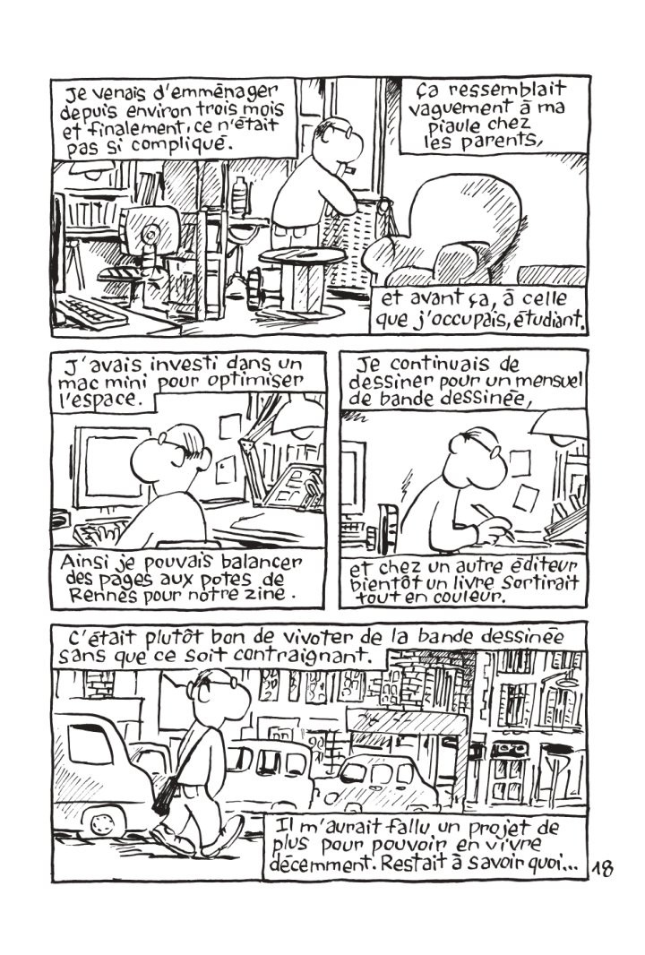 Oui et non, car avec cette liberté de choix, l’angoisse et les insécurités partagées pour tous les créateurs pointent immédiatement le bout de leur nez. Ces planches, sont-elles si intéressantes que ça ? Et après, quel projet entreprendre ? Et ces années qui filent toujours plus rapidement, les choses qui s'accumulent, que restera-t-il de tout ça ensuite ? Entre mini-crise existentielle et doute généralisé, le scénariste raconte les insignifiantes non-aventures qui ponctuent ses journées. Un peu de nostalgie, beaucoup de peurs et, quand même, de nombreuses notes d’humour, l’ouvrage détaille un quotidien morne et banal, heureusement éclairé ici ou là de moments de grâce. Dès que l’inspiration se met à couler, c’est une tout autre histoire qui démarre. Tout devient clair et les possibilités sont infinies ! Puis, l’instant d’après, c’est l’heure d’aller faire les courses ou de nettoyer la litière du chat.