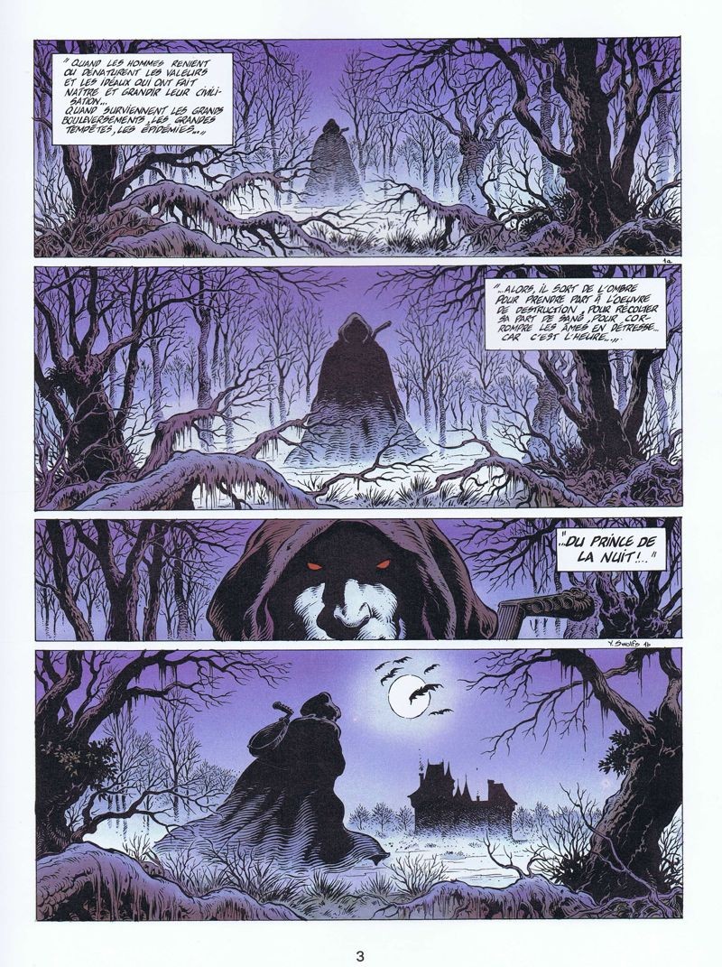 Avis portant sur la série: Cette série où se mêlent violence, amour et haine est une pure merveille. Quand on commence la lecture, on ne s'arrête plus tant l'histoire est réellement passionnante. Le dessin de Swolfs est magnifique tout comme la colorisation assurée par son épouse qui contribue à l'ambiance de cette série pas comme les autres. On a droit à un graphisme à vous couper le souffle (je devrais plutôt dire à vous glacer le sang). Je m'aperçois que le scénario paraît également incroyablement maîtrisé de bout en bout avec une quasi-absence de temps mort... Pour l'instant, il n'y a eu que deux petits cycles de 3 tomes chacun. Les admirateurs de cette bd réclament à corps et à cri une suite que laissait entrevoir l'épilogue. C'est dommage que son auteur ait eu envie de se consacrer à d'autres séries alors que celle-ci avait trouvé son public. On ne pourra certes pas l'accuser d'exploitation commerciale. Cela confère une véritable intégrité à ce chef d'oeuvre. J'ai bien aimé cette opposition entre la famille Rougemont et Vladimir Kergan, le prince de la nuit. C'est une lutte qui va s'étendre sur près de 700 ans. Chaque tome à l'exception du dernier nous conte une histoire d'un des ancêtres de cette dynastie familiale qui se mêle toutefois à une action présente située en 1933. Le lecteur est ainsi emmené du Moyen-âge jusqu'à la montée du nazisme en passant par l'Inquisition et la révolte des Chouans durant la Révolution. Je suis ébloui par autant d'efficacité. Je ne découvre que tardivement cette série car j'avais un peu une appréhension en lisant une énième histoire de vampires. C'était sans compter l'immense talent de Swolfs. Malgré le classicisme du thème, cette histoire restera comme l'une des plus grandes réussites du genre. Si seulement il n'y avait plus eu de suite, j'aurais maintenu la note culte. Cependant, le charme est rompu à cause d'une suite qui ne vaut absolument pas ce premier cycle. Certes, il est de bon ton d'élaborer des spin-off mais à force de céder à la tentation, on fait que dénaturer le mythe. Je n'ai plus eu de plaisir comme la première fois où j'ai découvert cette série. Cela aurait dû me plaire dans la mesure où le plaisir aurait été prolongé mais cela ne m'a pas fait cet effet. Pourtant, le dessin s'est nettement amélioré avec des planches réellement splendides. Une narration fleuve qui m'a un peu gâché le plaisir de la lecture. Conseil d'achat seulement pour les 6 premiers tomes décliné d'ailleurs en intégrale. Note Dessin: 4.5/5 - Note Scénario: 4/5 - Note Globale: 4.25/5Le 10/04/2018 à 15:29:31