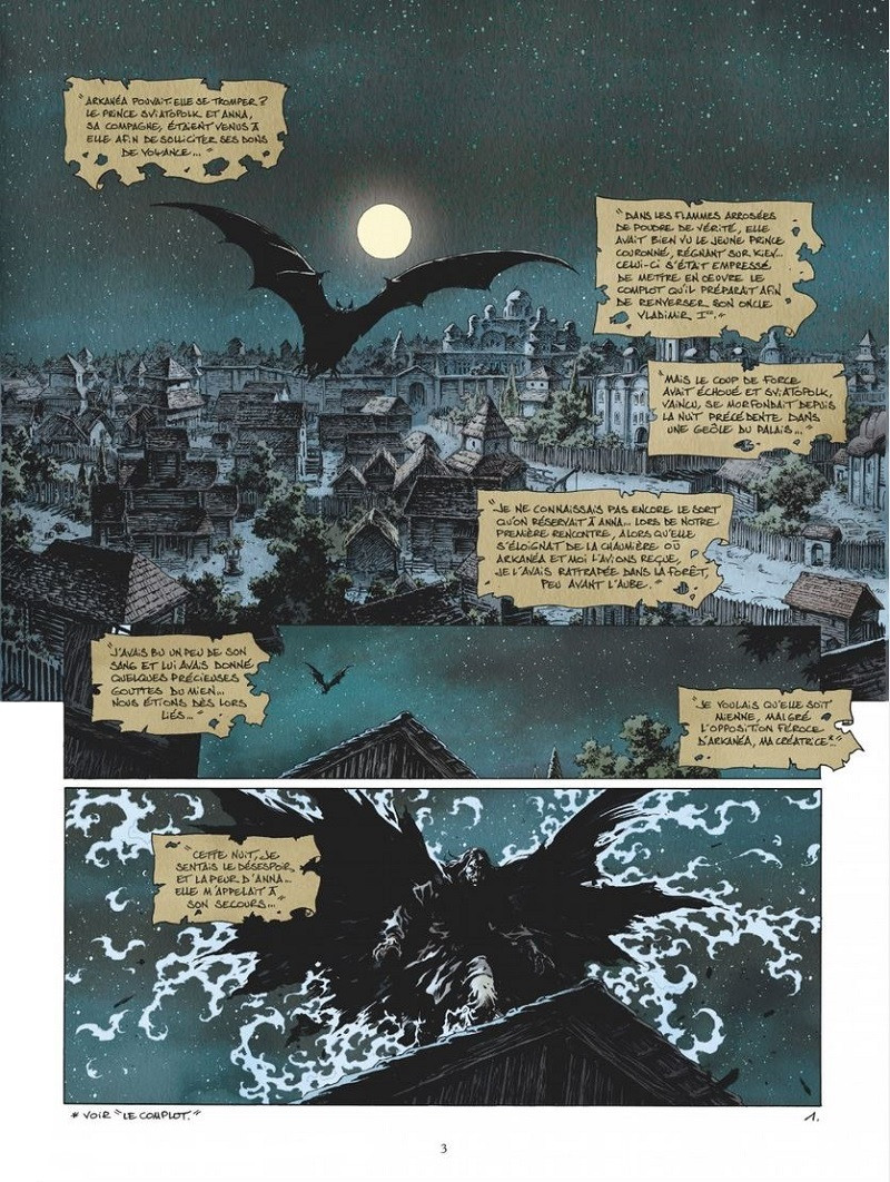 Résumé: Les liens du sang sont éternels... Kergan s'est désormais trouvé une nouvelle compagne en la personne d'Anna, qu'il a récemment transformée malgré les réticences d'Arkanéa. Mais alors qu'il croyait s'être émancipé de sa propre créatrice, celle-ci est capturée par Arthémius, conseiller religieux du prince Vladimir, et soumise à de cruelles tortures au sein d'un monastère. Car l'homme d'Église fait montre d'une ferveur redoutable pour mieux connaître la nature et l'origine des vampires. Au nom de son dieu unique, il s'autorise à devenir plus maléfique encore que les créatures qu'il prétend combattre. Partageant la souffrance d'Arkanéa, Kergan prend alors conscience de la puissance du pacte qui les unit. Les liens du sang sont éternels... Yves Swolfs poursuit son exploration des origines du Mal en retraçant le passé de son légendaire vampire en plein âge sombre de l'Europe centrale. Au dessin, Thimothée Montaigne transcende ce classique de la bande dessinée d'épouvante de son trait réaliste et y apporte un supplément de noirceur.
