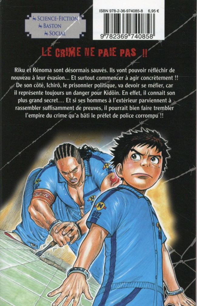 Résumé: Enfin sorti du mitard, Riku et Rénoma vont de nouveau pouvoir se concentrer sur leur évasion !! Ils ont trouvé le moyen de sortir du pénitencier et compte bien mettre leur plan à exécution sans que personne ne leur barre la route. D'autant plus que désormais, les membres du gang de Rénoma seront là pour les aider si jamais ils parviennent à l'extérieur !! Mais avant cela, nous découvrirons le passé d'Ichirô, un détenu emblématique, spécialiste de l'évasion et ancien révolutionnaire. Nous saurons enfin pourquoi, lui qui faisait parti de la haute société et était promis à un brillant avenir, à décidé de se rallier aux habitants du bidonville et de combattre le système plutôt que d'y participer !!
