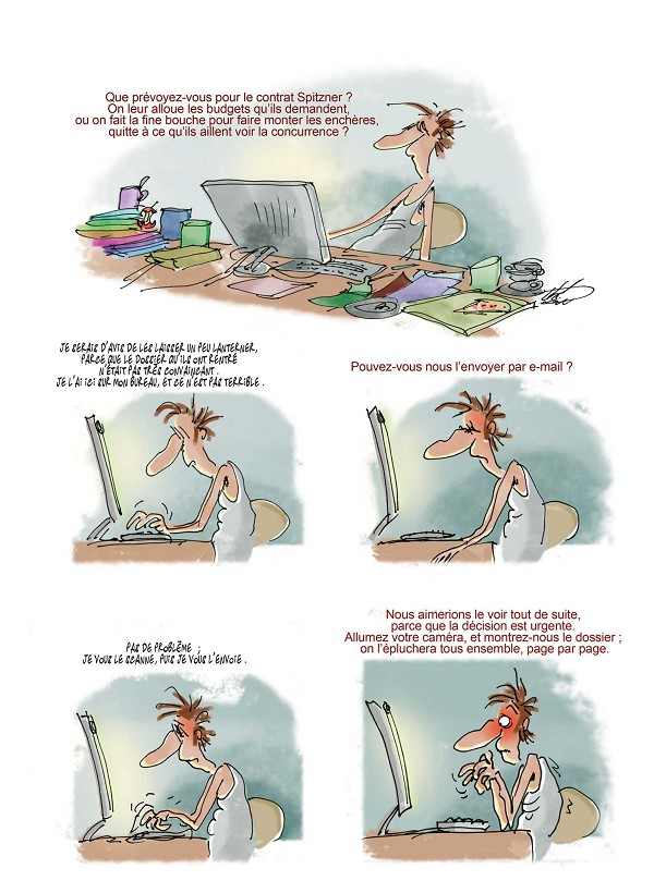 Sous la plume et le crayon de l’historien Gilles Dal et du "sociologue" Fred Jannin (après Germain et nous…, Didi, Que du bonheur ! et cet album, il va bien falloir lui trouver une chaire de type sociologie des organisations, département jeunesse, entreprises et informatique à cet homme-là), la démonstration fonctionne, avec, en bonus incomparable, un sourire qui se façonne progressivement au fil des cases. Les scènes, le plus souvent exposées sur une double page et mettant aux prises des personnages presque statiques (le lot de tout un chacun devant un écran), font mouche : face à la froideur des procédures et à l'abondance des informations à assimiler, l’utilisateur perd souvent les pédales, se trouve tourné en ridicule et son sort risque de sonner familièrement aux oreilles de nombreux lecteurs.