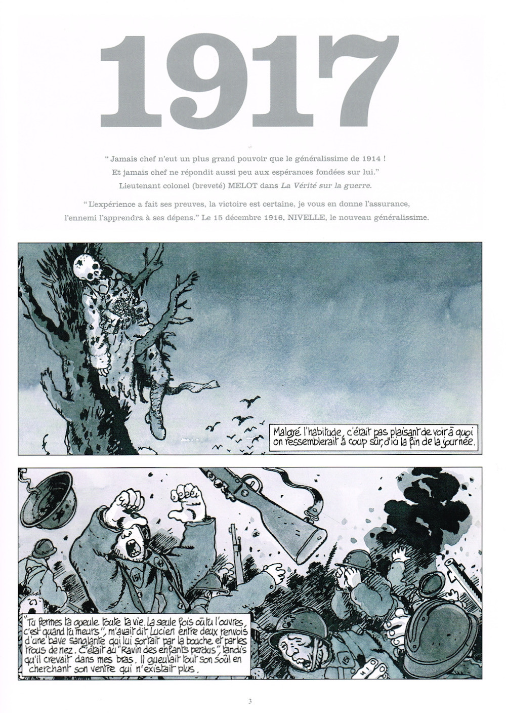 Avant d’être proposé en librairie en album, le deuxième volume de ce grand récit de Tardi a fait l’objet, comme le premier volet, d’une publication sous la forme d’un périodique grand format, à raison de trois numéros de vingt pages chacun. Ce tome 2 couvre les années 1917, 1918 et 1919 (les combats en effet, ce que l’on oublie souvent, se sont poursuivis dans certaines régions bien au-delà de la signature de l’armistice de novembre 1918).