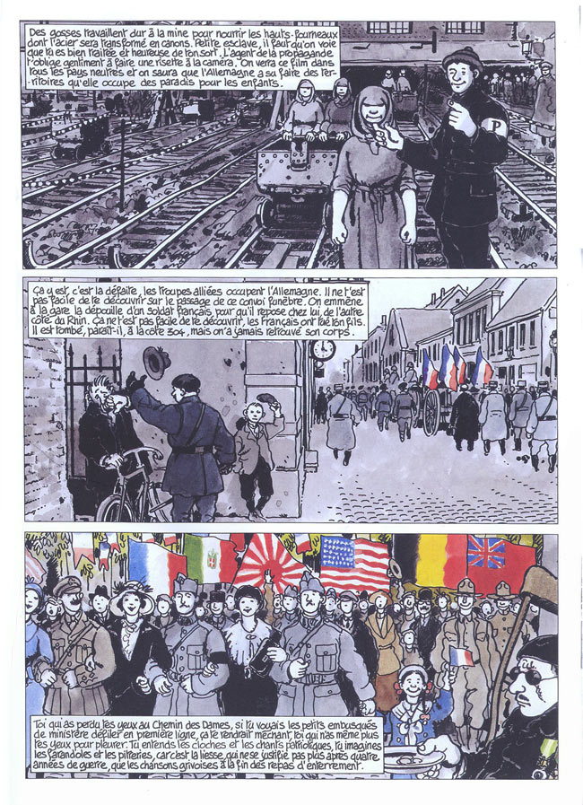 Ce nouveau projet, dans la forme, reprend le découpage en 3 strips par page déjà utilisé dans l’album C’était la guerre des tranchées. Le récit débute en couleurs, mais, au fil de sa progression chronologique, et à mesure que la guerre s’enkyste, s’étend et s’approfondit, adopte les tonalités de plus en plus monochromes de la boue et de la grisaille.