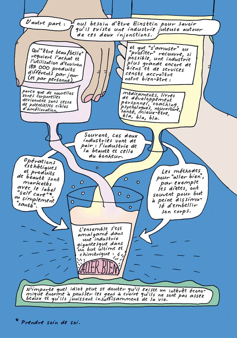 Ici, l’autrice partage des conseils pour développer un regard critique sur l’afflux d’astuces qui circulent sur Internet. Avec un regard incisif sur la société moderne, les oukazes assenés par des stars et youtubeurs pour atteindre la réussite sont tournées en dérision. Les prétendus experts en prennent aussi pour leur grade, fautifs de faire assimiler l’idée que le bonheur ne dépend que des efforts que chacun.e est prêt à déployer, provoquant une culpabilité en cas d’échec. Au fond, ce sont la course au bien-être et le désir de repousser la mort, dans une société profondément individualiste, qui sont questionnés : n'aurions-nous pas perdu de vue ce qui contribue réellement à notre bonheur ?