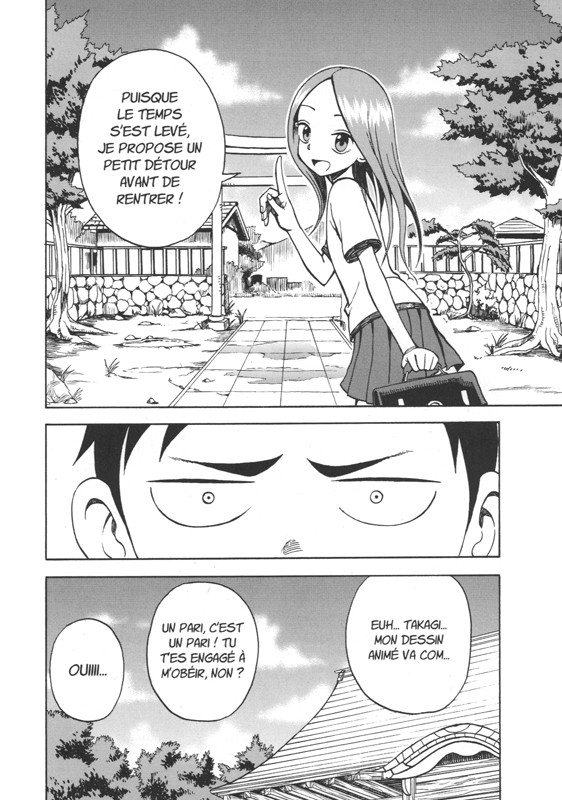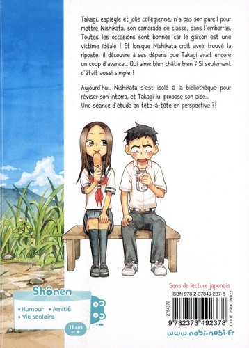 Résumé: Takagi, espiègle et jolie collégienne, n'a pas son pareil pour mettre Nishikata, son camarade de classe, dans l'embarras. Toutes les occasions sont bonnes car le garçon est une victime idéale ! Et lorsque Nishikata croit avoir trouvé la riposte, il découvre à ses dépens que Takagi avait encore un coup d'avance... Qui aime bien châtie bien ? Si seulement c'était aussi simple ! Aujourd'hui, Nishikata s'est isolé à la bibliothèque pour réviser son interro, et Takagi lui propose son aide... Une séance d'étude en tête à tête en perspective ?!