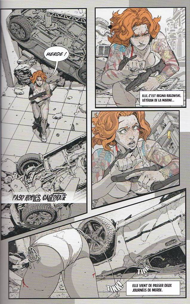 Des zombies et des boobs, voilà l'intérêt principal de ce bouquin . Alors les boobs sont bien présents sur chaque page et sont souvent très accueillants , en revanche les zombies, on ne sait pas grand chose sur eux, voilà qui est embêtant pour une histoire en deux tomes seulement . Vous aurez donc compris que ce premier tome ne fait que présenter la belle rouquine et sa paire de melons juteux dans des péripéties qui se ressemblent toutes (Elle trouve un lieu calme avec une communauté mais comme elle n'a pas de vêtement, ses nichons attirent les problèmes, faute d'inattention les zombies entrent dans le repère et saccagent tout ...et on recommence . On dirait les 4 dernières saisons de The Walking Dead) A part ça, l'humour est basé 90% du temps sous la ceinture et l'héroïne est une féministe progressiste, ce qui mène a des discours parfois ennuyeux sur la "bien-pensance" . Aussi les dialogues sont majoritairement vulgaires . Quant au dessin, j'ai apprécié l'idée sur le jeu de couleur . Les personnages et objets utiles seront en couleur, le reste en noir et blanc, à l'image des items en surbrillances dans les jeux vidéo . A noter que le livre a quelques pages mal imprimées, laissant certains mots sans leurs dernières lettre en bordure des pages . Conclusion : Assez fade dans son scénario, seuls les mamelons vous tiendront éveillés jusqu'au final . Je lirais le deuxième tome pour espérer connaitre le pourquoi du comment de ces zombies , et peut-être même y découvrir une solution, qui sait ?BDGest 2014 - Tous droits réservés