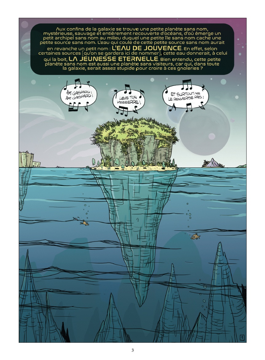 Résumé: Il y a bien longtemps, dans une lointaine galaxie...Après un sidérant voyage intersidéral, l'équipage du Kouklamoon se retrouve sur une petite planète sans nom, mystérieuse, sauvage et entièrement recouverte d'océans, d'où émerge un petit archipel sans nom au milieu duquel une petite île sans nom cache une petite source sans nom. L'eau qui coule de cette petite source sans nom aurait en revanche un petit nom : l'eau de jouvence. En effet, selon certaines sources (qu'on se gardera ici de nommer), cette eau donnerait, à celui qui la boit, la jeunesse éternelle ! Bien entendu, cette petite planète sans nom est aussi une planète sans visiteurs, car qui, dans toute la galaxie, serait assez stupide pour croire à ces gnoleries ?Les pirates fétiches de Nicolas Pothier et Frédérik Salsedo partent pour une nouvelle aventure hilarante... aux confins de la galaxie ! Pour l'occasion, c'est Frédérik Salsedo, le dessinateur originel de la série régulière Ratafia (désormais dessinée par Johan Pilet), qui reprend les commandes de ce spin-off. Ratafia Delirium, ou quand l'humour d'Astérix rencontre le monde sans limite de Star Wars !