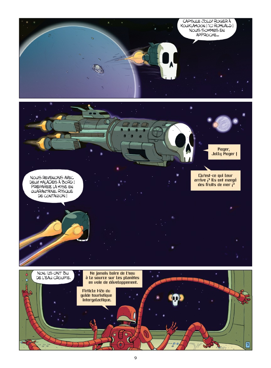 Comme l'a fait Arleston avec Lanfeust, Nicolas Pothier emmène les flibustiers de l'infortune en apesanteur. Le pire ratage en matière d'équipage, la pire raterie sur mer s'envoie donc en l'air ! La recette est la même, d'accord, mais toujours aussi savoureuse. Les multiples références et clins d'œil au genre du space-opéra (Star Wars, Albator, Mars attack...) abondent et les calembours et autres jeux de mots tirés par les cheveux (avale-t-il un clown chaque matin ?) parsèment les dialogues régulièrement, à tel point que le lecteur en cherche parfois là où il n'y en a pas. Preuve qu'après huit tomes, le scénariste en a encore de pleines charrettes ! Des morts-vivants, un trésor en «bitcogne», des extra-terrestres, une île déserte… Ah, quand même ! De cette situation loufoque, le fan ne se lasse pas et en redemanderait bien une suite.