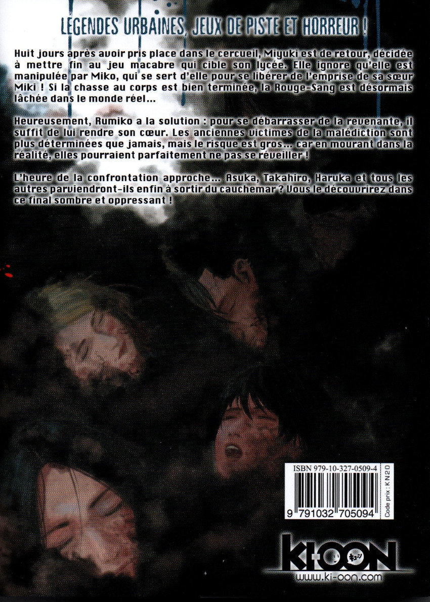 Résumé: Huit jours après avoir pris place dans le cercueil, Miyuki est de retour, décidée à mettre fin au jeu macabre qui cible son lycée. Elle ignore qu'elle est manipulée par Miko, qui se sert d'elle pour se libérer de l'emprise de sa sœur Miki ! Si la chasse au corps est bien terminée, la Rouge-Sang est désormais lâchée dans le monde réel...