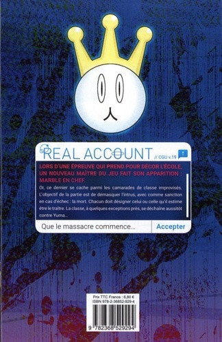 Résumé: Quand les réseaux sociaux prennent le contrôle de votre destin ! Avec Real Account, vous ne pourrez plus tricher sans le payer de votre vie ! Lors d'une épreuve qui prend pour décor l'école, un nouveau maître du jeu fait son apparition : Marble en chef. Or, ce dernier se cache parmi les camarades de classe improvisés. L'objectif de la partie est de démasquer l'intrus, avec comme sanction en cas d'échec : la mort.