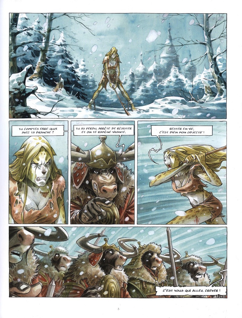 ussi frêle que la branche entre ses mains, Octavia fait face à un groupe d'aurochs prêts à en découdre pour la capturer ; une belle marchandise en perspective pour ces marchands d'esclaves. Quelques têtes éclatent et des panses s'ouvrent, mais la hargne de la guéparde ne suffit plus et arrive le moment où elle est submergée. Il était temps que Pantacius et Isaac lui prêtent main forte. Ils lui proposent alors une nouvelle vie, de mercenaire certes, mais avec la liberté en prime. C'est dans ces circonstances barbares que les trois compagnons se sont rencontrés et ne se sont plus quittés. Après les années de galère et de combats, ils sont toujours aussi soudés. À présent, ils font face à la forteresse de Shrine avec au cœur, la promesse de protéger les petits orphelins et pour seul obstacle : l'offrande aux moines. Quand il n'y a rien à offrir, que donner ?
