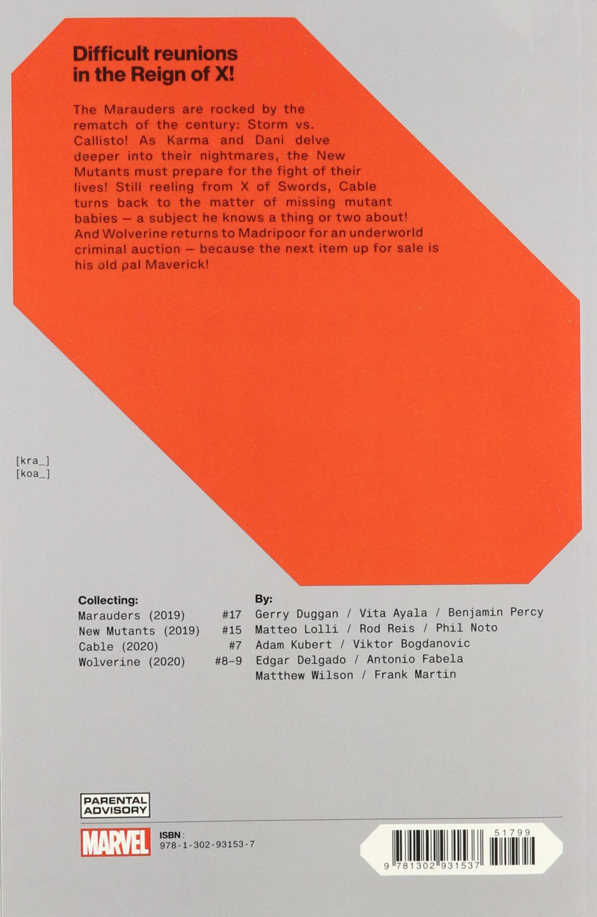 Info édition : Volume 3 - 1st printing. Collects MARAUDERS (2019) #17, NEW MUTANTS (2019) #15, CABLE (2020) #7 and WOLVERINE (2020) #8-9.