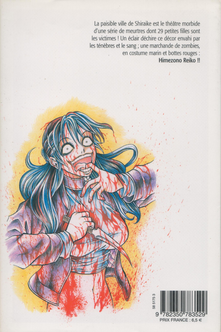 Résumé: La paisible ville de Shiraike est le théâtre morbide d'une série de meurtres dont 29 petites filles sont les victimes ! Un éclair déchire ce décor envahi par les ténèbres et le sang. Une marchande de zombies, en costume marin et bottes rouges, Himezono Reiko !!!
