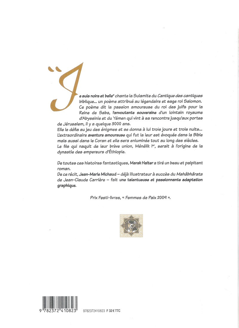 Résumé: Une nouvelle BD exceptionnelle de Jean-Marie MICHAUD d'après l'oeuvre éponyme de Marek HALTER inspirée de la Bible et du Coran. 260 pages d'aventures passionnelles et passionnantes par le dessinateur talentueux du Mâhabhârata de Jean-Claude CARRIÈRE. " Je suis noire et belle" chante la Sulamite du Cantique des cantiques... un poème attribué au roi Salomon. Il évoque l'amour du roi juif et de la Reine de Saba, l'envoutante reine d'Abyssinie qui vint à sa rencontre à Jérusalem, il y a 3000 ans.La fantastique aventure amoureuse qui fut la leur est évoquée dans la Bible et le Coran et elle a été commentée tout au long des siècles.Le fils qui naquit de leur brève union est à l'origine de la dynastie des empereurs d'Éthiopie jusqu'à Hailé Sélassié.Marek Halter en a fait un roman primé en reprenant tout ce qui a été raconté au fil des siècles. Jean-Marie Michaud a en fait une talentueuse et passionnante BD de 260 pages !