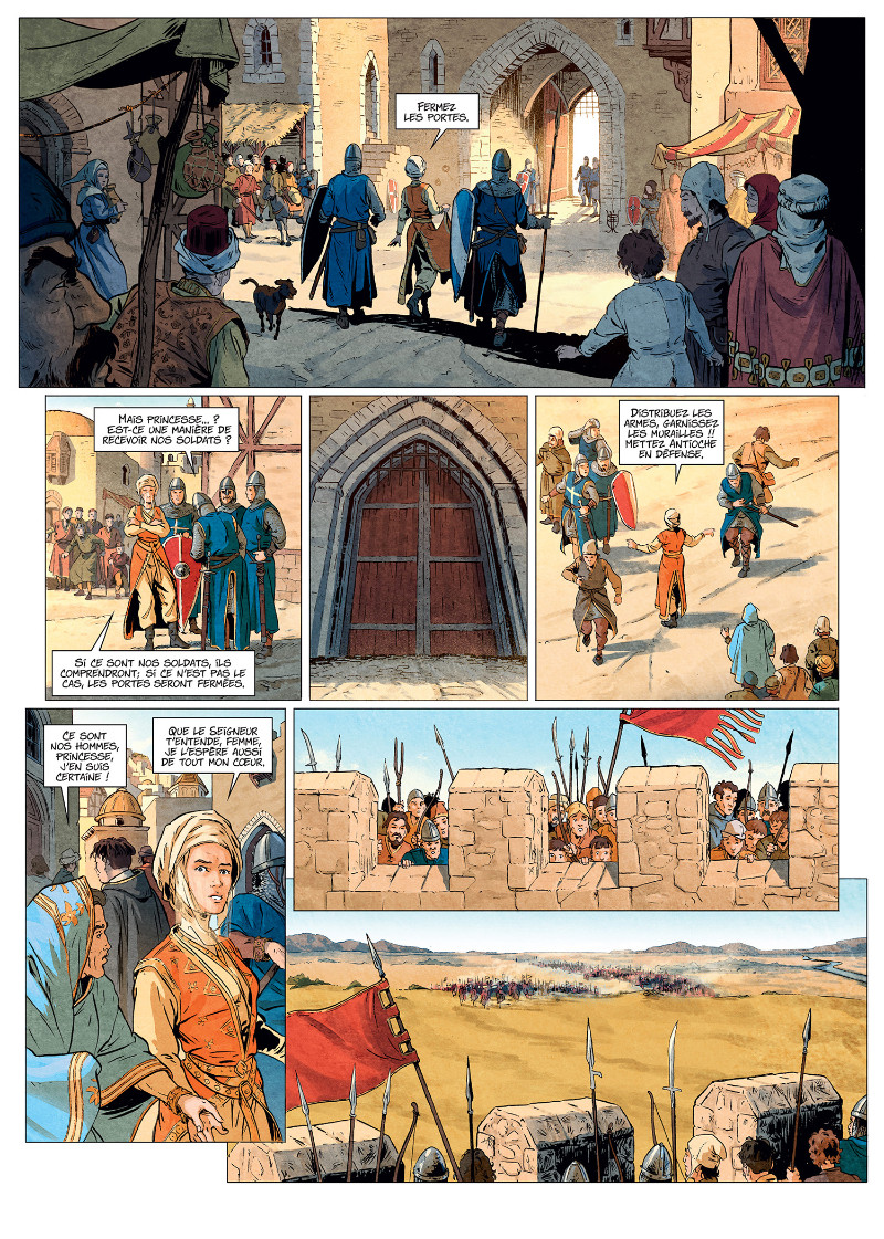 Dans ce deuxième volet, Jean-Pierre Pécaud (Wonderball) retrace la période d’une quinzaine d’années durant laquelle son héroïne a pleinement régné sur Antioche, d’abord seule, puis avec son consort. Elle n’est plus une frêle héritière en butte aux manigances de son entourage qui doit louvoyer pour survivre et s’imposer, mais une femme de caractère dont la sagacité et la volonté ont déjà été éprouvées. Le scénariste montre bien combien elle se soucie de ceux qu’elle gouverne et de leur devenir – ses conseils à son héritier en témoignent -, mais également comment elle parvient à tirer son épingle du jeu complexe qui se déroule au Proche-Orient, en fine connaisseuse des hommes qu’elle doit affronter. Le contraste est alors d’autant plus frappant avec les manières directes et brutales de Renaud dont certains emportements voient leurs conséquences fâcheuses endiguées – de justesse – par les talents diplomatiques de Constance. Le dessin de Gabriele Parma et la colorisation de Dimitri Fogolin accompagnent agréablement la narration. Les scènes extérieures offrent souvent de belles vues, tandis que les cadrages plus rapprochés se révèlent expressifs – la tendresse et la complicité entre le couple princier sont palpables. Seuls quelques poses ont un rendu un peu figé ou moins convaincant.