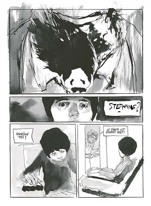 Par petites touches, Stéphane Levallois amène son lecteur sur les chemins qui l’ont conduit à coucher sur papier cette part intime de l’histoire de ce grand-père qu’il n’a pas connu. La maison de sa grand-mère, au mobilier et confort d’une autre époque, silencieuse, est propice à laisser vagabonder ses pensées. Alors que le contexte se met en place, doucement, c’est au détour d’une peur enfantine qui se révèle, que l’absent des lieux lui apparaît. Sa puissance physique, symbolique, cède rapidement la place à une détresse sans fond, merveilleusement retranscrite par un graphisme d’une force évocatrice peu commune. Le dessinateur démontre une capacité rare à exprimer la palette des sentiments avec une justesse confondante, jouant de la technique du lavis avec virtuosité.