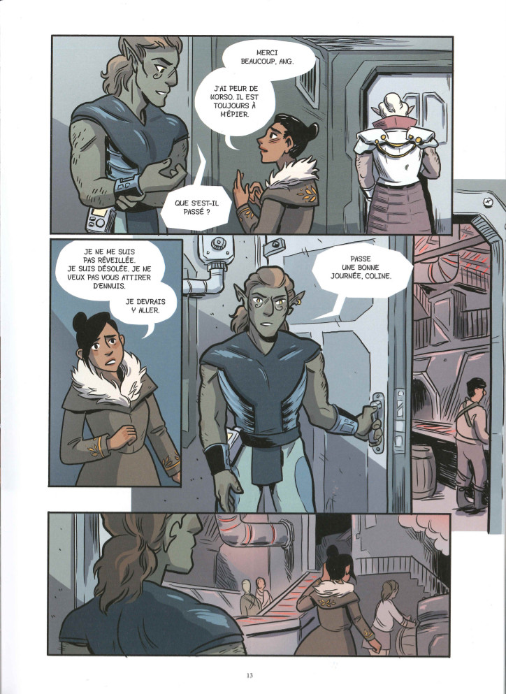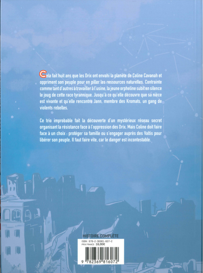 Cette histoire d'aventure à tendance fantastique met en scène une jeune héroïne courageuse, dont le peuple est opprimé suite à l'invasion de sa planète par les Dricks. Pour ces êtres autant avides d'exploration que des ressources des planètes conquises, la vie des autochtones n'a que peu d'importance, seul compte leur dessein. L'autrice propose une mise en place un peu poussive. D'une part, les nombreuses informations, notamment pour poser le contexte politique, alourdissent par trop le propos. De l'autre, ses personnages - hormis Coline - ne se montrent guère attachants, du moins de prime abord. Mais, après une quarantaine de pages (avec l'arrivée de Lucie en somme), les forces en présence sont clairement identifiées, les enjeux parfaitement exposés et la curiosité s'accroît. Grâce à un équilibre réussi entre action grandissante et relations entre les divers protagonistes, la scénariste déroule un récit fluide, rythmé par nombre de rebondissements. Si certains sont quelque peu convenus, rien de franchement rédhibitoire à la pleine immersion. Le destin de Coline intéresse au point qu'il tarde d'arriver au terme des 244 planches pour connaître son devenir. Sur ce point, le lecteur curieux risque de rester sur sa faim, la conclusion offerte ne clôture pas réellement l'intrigue, au contraire, elle ferait même un point de départ idéal pour de nouvelles péripéties.