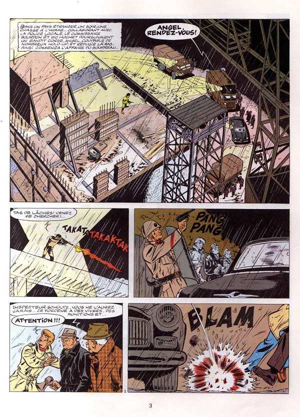 On retrouve ici un retour à ce que je qualifierais de 'première vague thématique' de la série, celle de l'espionnage et des aventures sans véritable intrigue policière. Dans un style complètement différent, on y retrouve un peu l'angoisse qu'on ressent en lisant Cauchemar pour Ric Hochet ou Les spectres de la nuit. Pour ma part, je trouve que l'ambiguité autour du pays inconnu que visitent Ric et Bourdon au début de l'aventure brouille beaucoup trop notre compréhension du personnage du Bourreau et de ses motivations. Même chose pour le personnage de Wittek. En rendant le contexte dans lequel ces personnages s'insèrent trop flou (ou plutôt implicite), ils sont en quelque sorte vidés de leur sens et deviennent des caricatures. Ce n'est pas un mauvais album pour autant, mais j'aurais aimé que les auteurs aillent au bout de leur propre logique.Le 17/01/2010 à 15:12:22