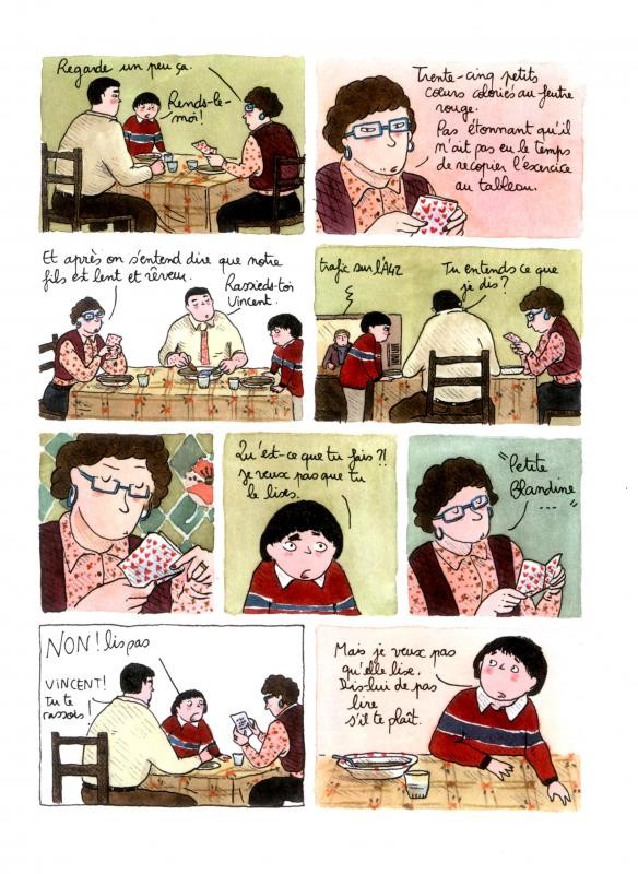 "Rosalie Blum" ne m'a pas plu. Pour tout vous dire, je n'ai pas terminé l'intégrale. Premièrement, les personnages bien que sympathique sont très passifs, donc peu de possibilité de représentation de scènes dynamiques. Le cadrage rentre dans la même veine, peu de changement de plan, c'est plutôt mou. Les protagonistes passent leur temps à se suivre, de manière encore une fois très passive, nous sommes dans la complaisance de l'inaction, de la timidité ou de la flemme. Que cela soit Vincent ou Rosalie, il représente une personne lambda sur lesquels on mise une vie moins morose, c'est vite déprimant. Certains diront que cette monotonie est révélatrice d'une singularité, d'une simplicité qu'il est bon de souligner, moi pas. La mère de Vincent, plus excentrique remonte un peu le niveau. Un humour doux et délicat, qui m'a fait sourire parfois, mais c'est tout. Le dessin est cohérent avec les personnages et l'univers, mais encore une fois, il ne me parle pas. Ce qu'il y a de plus plaisant reste la mise en couleur soigné. Ce n'est pas pour ce genre d’œuvre que j'aime la BD et que je la cultive, trop plat, trop terre à terre, simple et peu ambitieux, même si je comprends qu'on peut s’émerveiller des petites choses du quotidien. Bref, "Rosalie Blum" peut faire sa vie, j'irais faire la mienne, car j'ai du mal à capter la poésie de cette BD et à réaliser que Vincent Machot n'a que 30 ans et non pas 50 ans comme peut le laisser croire son rythme de vie.BDGest 2014 - Tous droits réservés