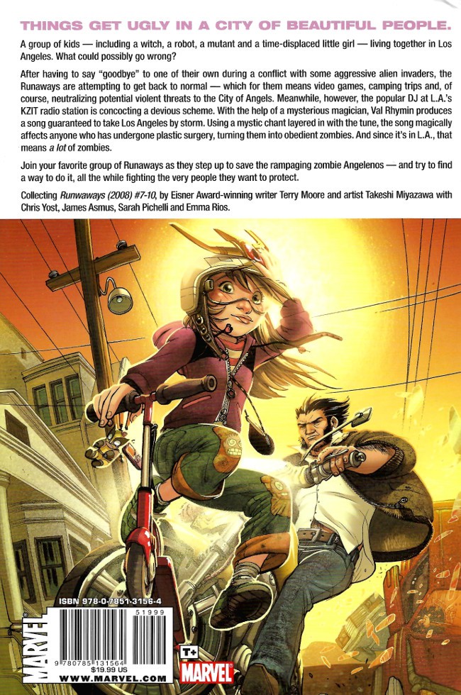 Info édition : Bookstore Edition. Contient Runaways (2008) #7-10. Sous la jaquette, couverture blanche avec logo de la série embossé. Carnet de croquis de 4 pages en fin de recueil. Noté "First printing 2009".