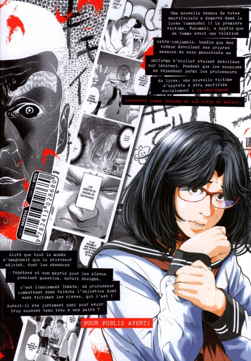 Résumé: Un jour, l'application nommée « Sacrificial Vote » apparaît sur le smartphone de Minato Imabari. Les participants s'avèrent être tous ses camarades de classe. La victime est ainsi désignée afin d'être « assassinée socialement ». Une simple impulsion pousse Minato à voter contre son amie, sans savoir que cette première élection entraînera des conséquences irréversibles sur la vie en classe...