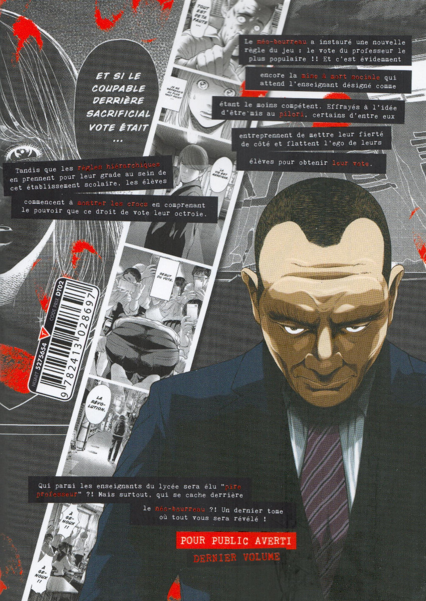 Résumé: Le néo-bourreau a instauré une nouvelle règle du jeu : le vote du professeur le plus populaire !! Et c’est évidemment, encore la mise à mort sociale qui attend l’enseignant désigné comme étant le moins compétent. Effrayés à l’idée d’être mis au pilori, certains d’entre eux entreprennent de mettre leur fierté de côté et flattent l’ego de leurs élèves pour obtenir leur vote. Tandis que les règles hiérarchiques en prennent pour leur grade au sein de cet établissement scolaire, les élèves commencent à montrer les crocs en comprenant le pouvoir que ce droit de vote leur octroie.